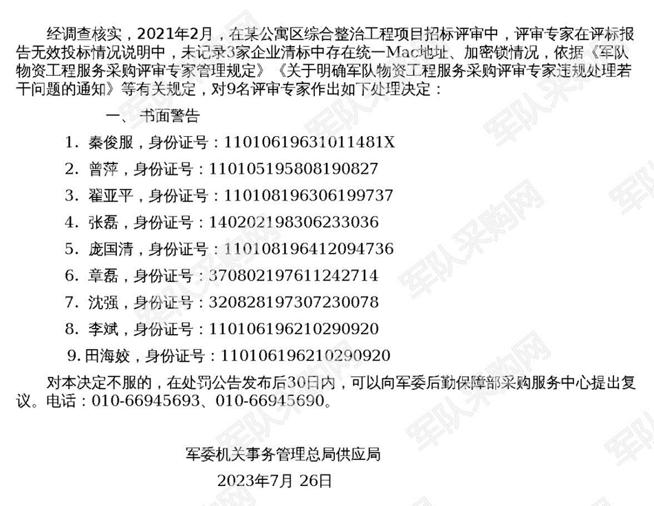 该公告非常具体,称军委装备发展部长期以来寻求消除内部贪污腐败,曾在2019年的军用信息系统装备招标采购代理业务工作座谈培训会上强调过“严格规范招标采购管理秩序”,且已在每个项目成立监督组监督招标工作开展;谈判询价环节录音录像以备案备查;畅通投标单位反映问题渠道,以促进公正采购。紧接着,军队采购网在7月27日公布了十项评标专家违规问题记录,内容主要包括评标专家评审失误,让不应通过符合性审查的企业通过了审查、或者应该废标不废标,不用废标却强制废标等问题。还有9位评标专家未曾报告企业的围串标行为(三家企业共用同一个MAC地址和加密锁)而被警告处罚。
