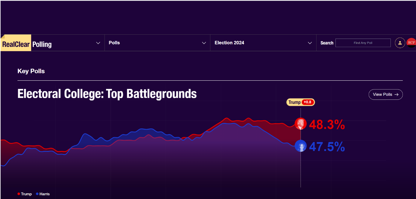 但这种勉力维持的微弱领先优势,在10月15日哈里斯接受Fox采访之后也无法继续,就连始终不渝力挺民主党的RealClearPolling也不得不下调选情数据,下图是10月18日关于七大战场州的双方支持率: